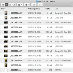 Die Bilddatei besteht aus den eigentlichen Bilddaten, die das Foto darstellen und den Kopfdaten, auch Header genannt, d.h. den Bereich am Anfang der Bilddatei, noch vor den eigentlichen Bildinformationen, die zusätzliche Informationen, die sogenannten Metadaten, enthalten. Die Dateiinformationen werden von dem jeweiligen Computersystem geliefert bzw. angezeigt. Die wichtigsten Dateiinformationen sind der Name der Datei, der Dateityp, das Datum und das Icon bzw. die Symbolvorschau. Zu beachten ist, dass das Datum hier nicht das Aufnahmedatum ist, sondern das Datum, an dem die Datei dem Datensystems des Computers hinzugefügt bzw. dort geändert worden ist.